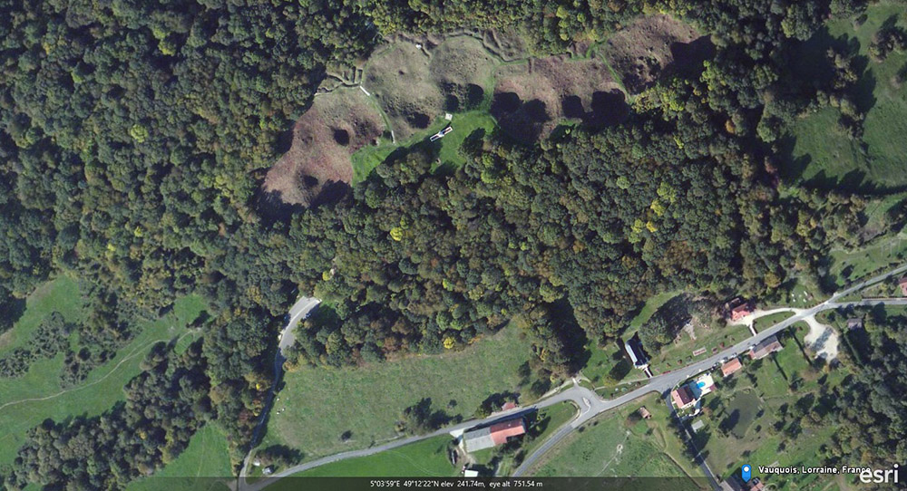 Finally, here is an overview of Vauquois from Arcgis. The top of the butte is still largely bared; the sides have filled in with trees.