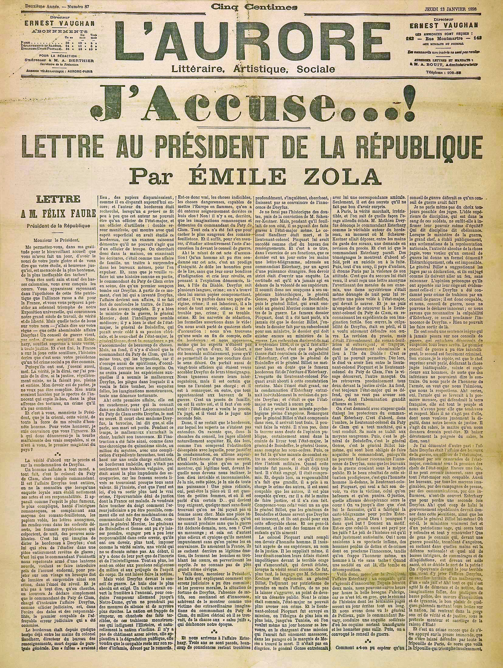 Then, Émile Zola got involved in the Affair. Zola was at the height of his worldwide literary fame, and he became convinced of the innocence of Dreyfus. He was aghast at the extent of the government/military cover-up. After long contemplation of exactly what he could do, on 13 January 1898, he published an open letter to Félix Faure, the president of France. In the letter, Zola ridiculed the case against Dreyfus and accused a whole series of people from the president on down of allowing the injustice to take place. To the left is an image of the paper with the famous headline "J'accuse!" (I accuse!) that Clemenceau had brilliantly devised for the article.
