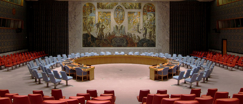 Photo of the Security Council meeting room at the United Nations headquarters in New York; photo source