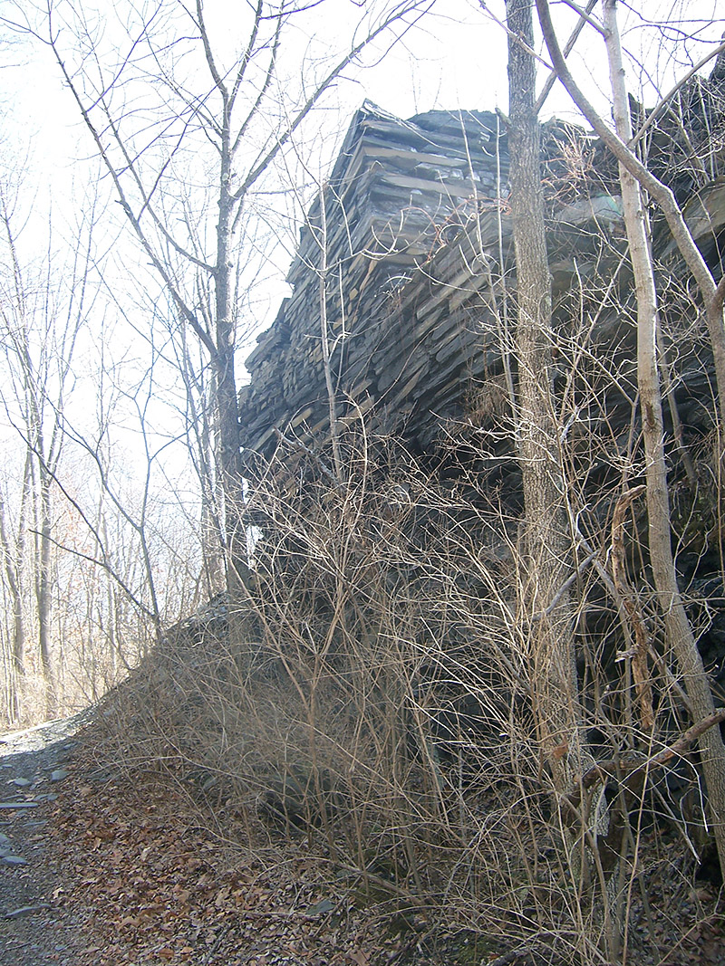If you were to walk the area around Slatington today, as I have done, you will find little that remains of the town's once thriving industrial past--You've got to be careful when you take such a walk because much of the land is private property and some of it is actually a little on the dangerous side. What remains, besides the piles of discarded waste slate, are some piled slate where the cranes and buildings once stood. All of the buildings--most of which were rather ramshackle wooden structures--have disappeared. You might find some cable moorings left in the ground where the derrick structures were anchored, but that is about it. There are also big holes in the ground that are now filled with water. These were the quarries of a century ago from where the slate was blasted out. These quarries and mounds of slate are the ruins of this country's industrial age.