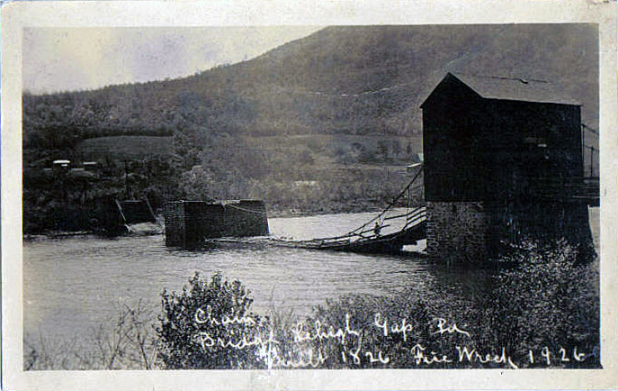 - View of the burned bridge; this postcard was based on a photograph that appeared in The Morning Call, 30 May 1926