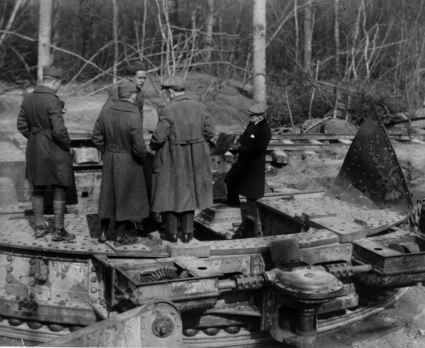 President Wilson inspects what is left of Big Bertha. The German artillery piece was the largest in World War I.