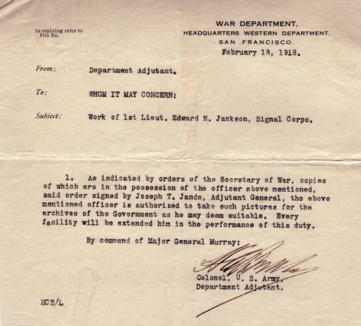 Despite being pretty old when World War I broke out (30), Jackson ended up enlisting in the Army Signal Corps. Because of his photography background, he was assigned to duty as an official war photographer. Jackson spent almost a year photographing the battlefields of France and was awarded a battlefield promotion to the rank of captain. When President Wilson traveled to Europe for the Paris Peace Conference, Jackson was assigned directly to President Wilson’s party.