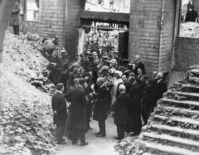 The Belgian King and Queen visit the remnants of the Louvain library, once one of the world's greatest, 19 June 1919